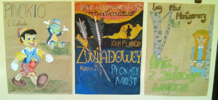 Wchodząc do klas, uczestnicy gry szkolnej "W Książkolandii" poznawali różne książki. Drzwi prowadzące do baśniowego świata były przyozdobione plakatami w formie okładek książek ilustrującymi poszczególne tytuły.