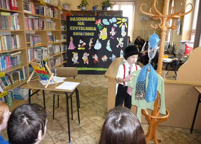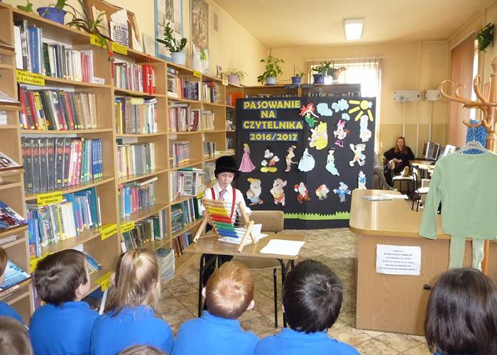 Dzieci czytały prośby, które miałaby do nich książka. Później nastąpiło pasowanie, oczywiście przy pomocy wielkiej książki. Pierwszoklasiści otrzymali małe upominki: dyplomy „Pasowania na czytelnika”, gazetkę „Wieści Biblioteczne”, plan lekcji oraz zakładki do książek wykonane przez uczniów klas 4-6 na konkurs z okazji Międzynarodowego Miesiąca Bibliotek Szkolnych . Uroczystości zostały uświetnione występami dwóch utalentowanych uczennic – Amelki Cygan z kl. 5b, która recytowała wiersz Jana Brzechwy „Kwoka” oraz Kingi Żarczyńskiej z kl. 4a – laureatki nagrody „Talent 2016” w Wadowickim Centrum Kultury w kategorii teatr. Kinga przedstawiła fragment „Małego Księcia” . Występ został przyjęty przez pierwszaków entuzjastycznie, godzina w bibliotece szybko minęła i uczniowie musieli wracać do klasy. Mamy nadzieję, że nowi czytelnicy będą u nas częstymi gośćmi.