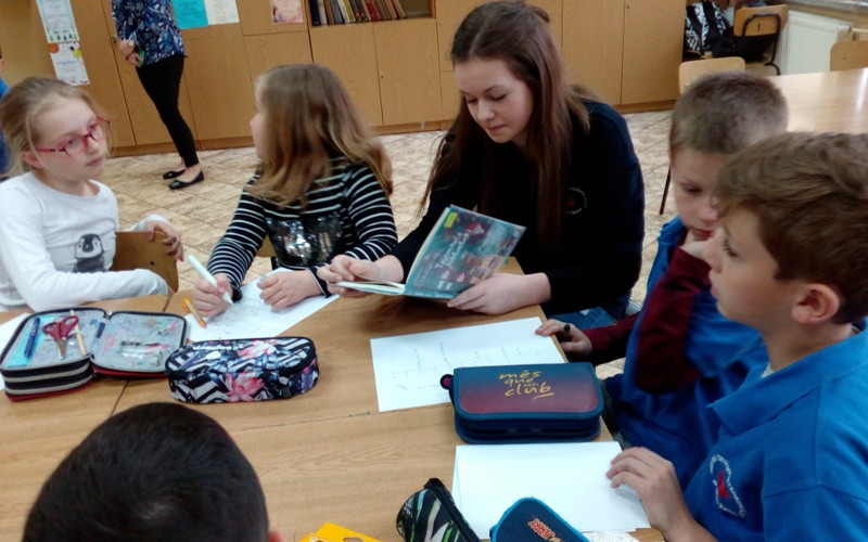 Po odczytaniu listu w wersji angielskiej i polskiej była dyskusja o uczuciach towarzyszących dzieciom podczas czytania różnych książek, a następnie uczestnicy wybierali zdjęcie symbolizujące jedno z uczuć i gromadzili się wokół niego. Kolejną atrakcją było wyjaśnienie tematu zajęć, czyli zaprezentowanie jak można rosnąć wraz z książką. Dziewczęta prowadzące zajęcia pokazywały przygotowane wcześniej własne „miarki czasu” z tytułami ulubionych książek z różnych okresów życia. Potem swoje miarki czasu przygotowywali milusińscy i, mimo że były one krótsze, to zawierały podobne tytuły z klasyki literatury dziecięcej takie, jak „Kubuś Puchatek” czy „Harry Potter”. Zajęcia zakończyły się głośnym czytaniem w różnych, mniejszych i większych, grupach, bowiem każdy z uczestników wybierał jedną z 6 książek zaproponowanych przez prowadzące spotkanie gimnazjalistki. Propozycje trafiły w gusty najmłodszych, bo po skończonych zajęciach cała grupa stawiła się w bibliotece szkolnej i pożyczała kolejne książki już do samodzielnego czytania w domu.