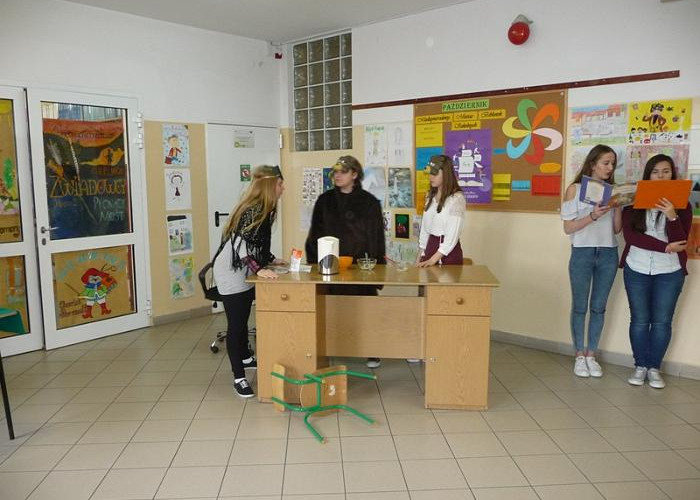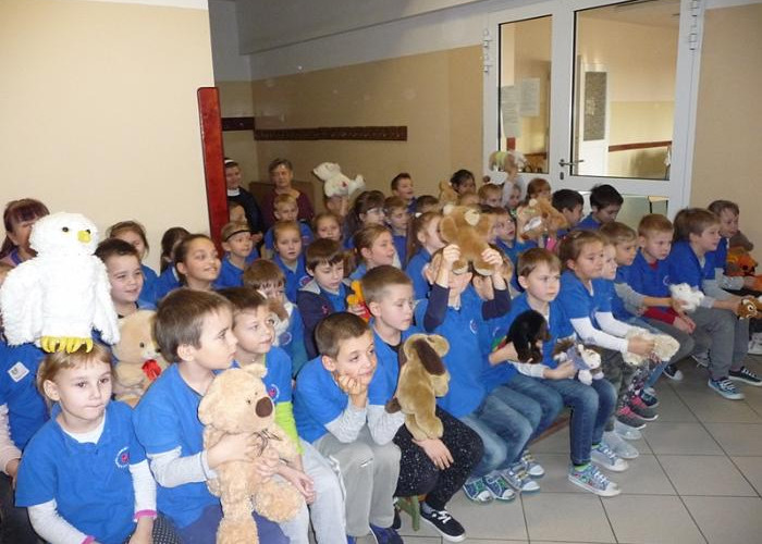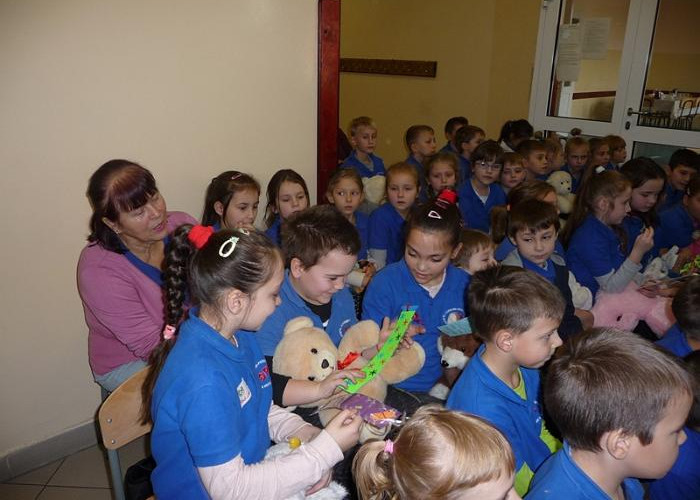 Na trzeciej lekcji wszyscy milusińscy przybyli na korytarz koło biblioteki wraz ze swoimi ulubionymi pluszakami przyniesionymi z domu. Na początku dzieci wysłuchały wierszy o misiach. Później poznały historię pluszowego misia. Następnym punktem programu były odwiedziny trzech misiów, które opowiadały o sobie. Przybył do nas więc Kubuś Puchatek, Miś Uszatek i Miś Paddington. Potem odbyła się zgaduj-zgadula i dzieci rozpoznawały misie po opisie. Najlepsi i najszybsi otrzymali w nagrodę zakładki do książki. Gwoździem imprezy było przedstawienie dwujęzyczne angielsko-polskie pt. „Złotowłosa i 3 misie” przygotowane przez wspaniałe gimnazjalistki świetnie władające językiem angielskim. Na zakończenie prowadzące przedstawiły jeszcze różne ciekawostki przyrodnicze dotyczące niedźwiedzi brunatnych i przeprowadziły krótki konkurs wiedzowy. Dzieci otrzymały też kolorowanki z Kubusiem Puchatkiem oraz słone co nieco. Znaną piosenką „Jadą, jadą misie” pożegnaliśmy się z naszymi małymi gośćmi. Mamy nadzieję, że udało nam się zwrócić uwagę na, może już przez niektórych zapomniane, pluszaki.