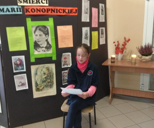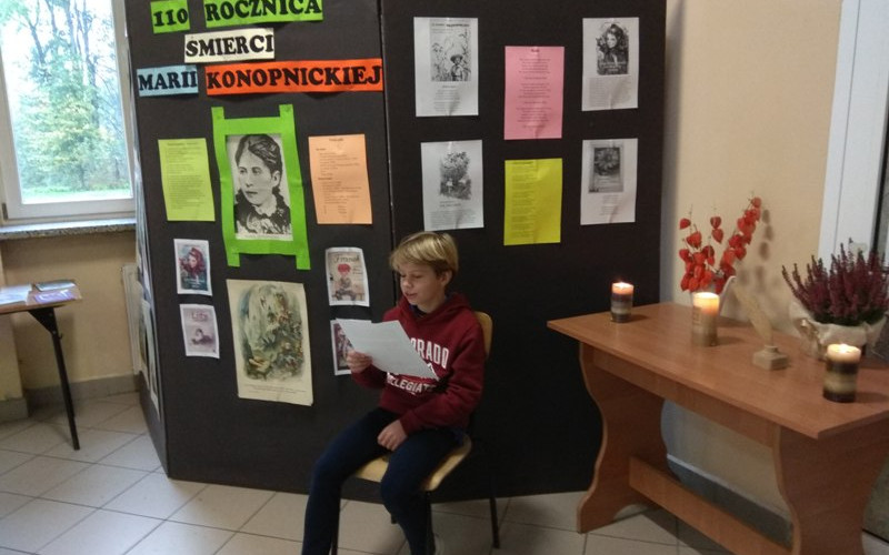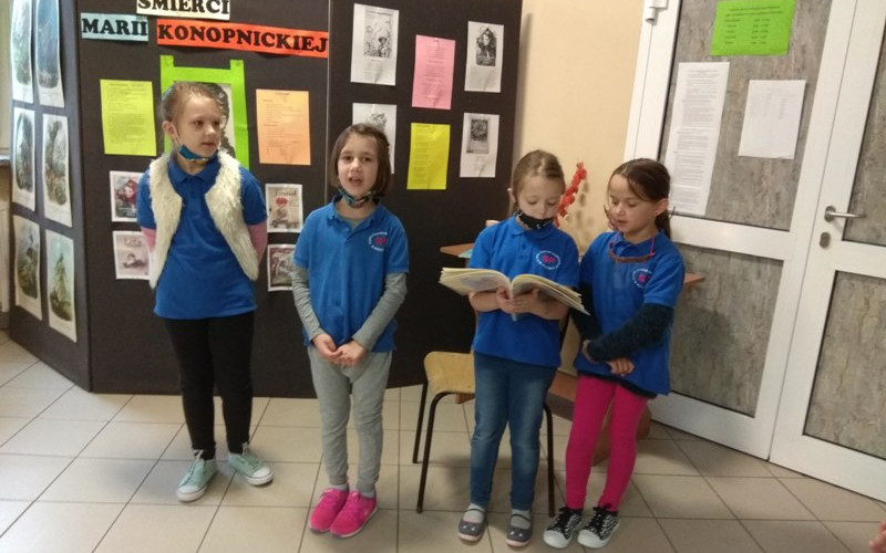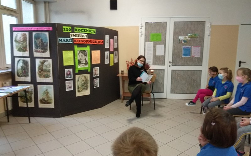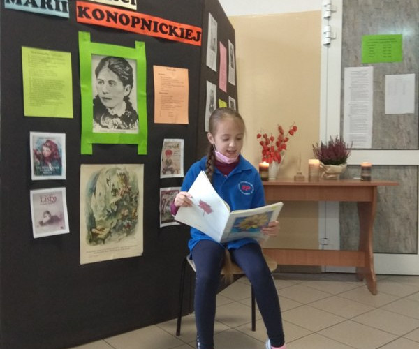 Z okazji Międzynarodowego Miesiąca Bibliotek Szkolnych oraz 110 rocznicy śmierci Marii Konopnickiej odbyły się w naszej szkole poranki czytelnicze poświęcone twórczości tej autorki piszącej także dla dzieci. W dniach 15 - 19 października kolejne klasy z grupy wiekowej 1-3 gościły w bibliotece szkolnej. Uczniowie wysłuchali informacji o życiu i twórczości Marii Konopnickiej, obejrzeli wystawkę jej książek oraz wysłuchali wierszy i fragmentów prozy w wykonaniu kolegów z klasy. W jednym dniu utwory czytała również pani dyrektor Ewelina Kutermak. W akcji wzięło udział 112 uczniów. Wszyscy czytający uczniowie podeszli do zadania profesjonalnie i pięknie interpretowali stare, ale czasami bardzo aktualne utwory.